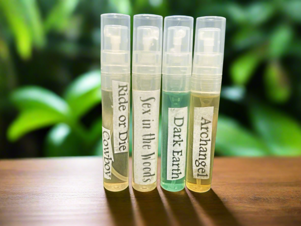 Discover Ariel’s Alchemy’s mini androgyny perfume sample set. Discover 4 exceptional fragrances that have a masculine touch, suitable for all genders. The set features: Ride or Die Cowboy, Sex In the Woods, Archangel and Dark Earth. For only $10, enjoy our 5ml bottles in the sample set. As a bonus, receive a complimentary sample of a new scent from our upcoming collection. Don't pass up this opportunity!